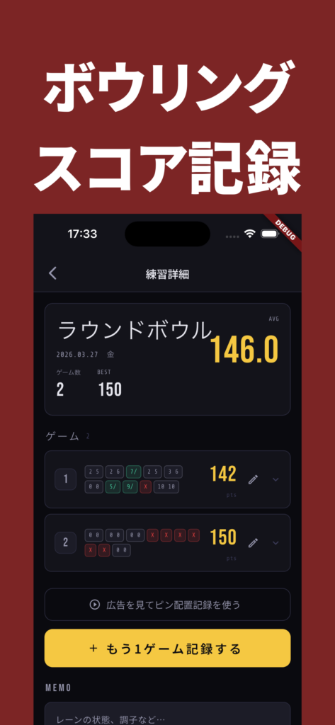 「今日はオイルが多めだった」「右へのドリフトを修正したい」「4フレームのスプリットが痛かった」——そんな気づきをスコアと一緒に記録できます。振り返ることで、次の練習につながります。