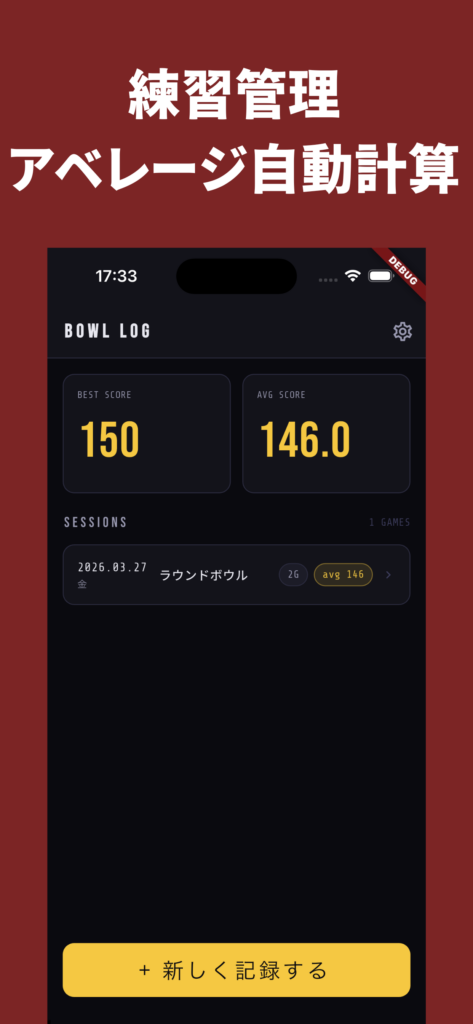 日付とボウリング場名を記録してセッション単位で管理。1回の練習で何ゲーム投げたか、アベレージは何点だったかを一覧で確認できます。練習の積み重ねが見えることで、モチベーションが続きます。