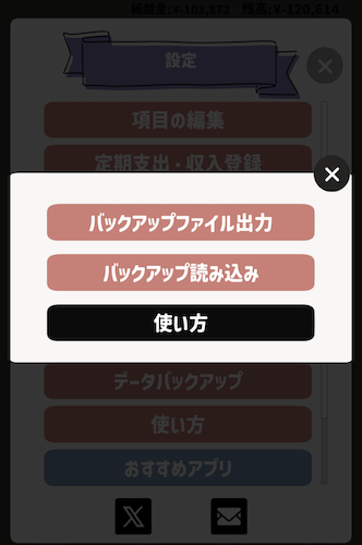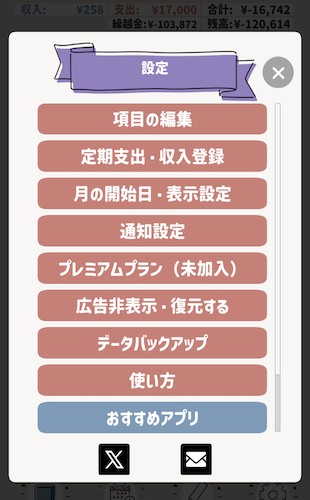 収支データ、カテゴリー設定、メンバー情報、定期収支、アプリ設定など